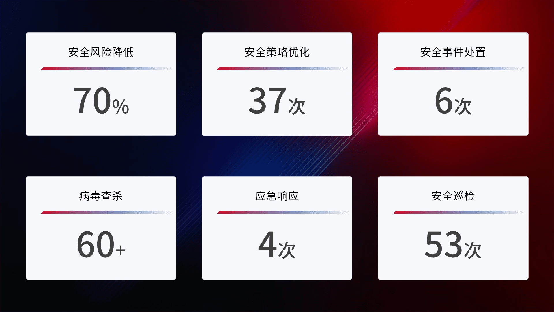 提供全面的安全事件报告体系,,,,包括处置报告、、、、周报、、、、季度和年度总结,,,结合持续监控,,,帮助客户深入了解网络安全状况。。。
