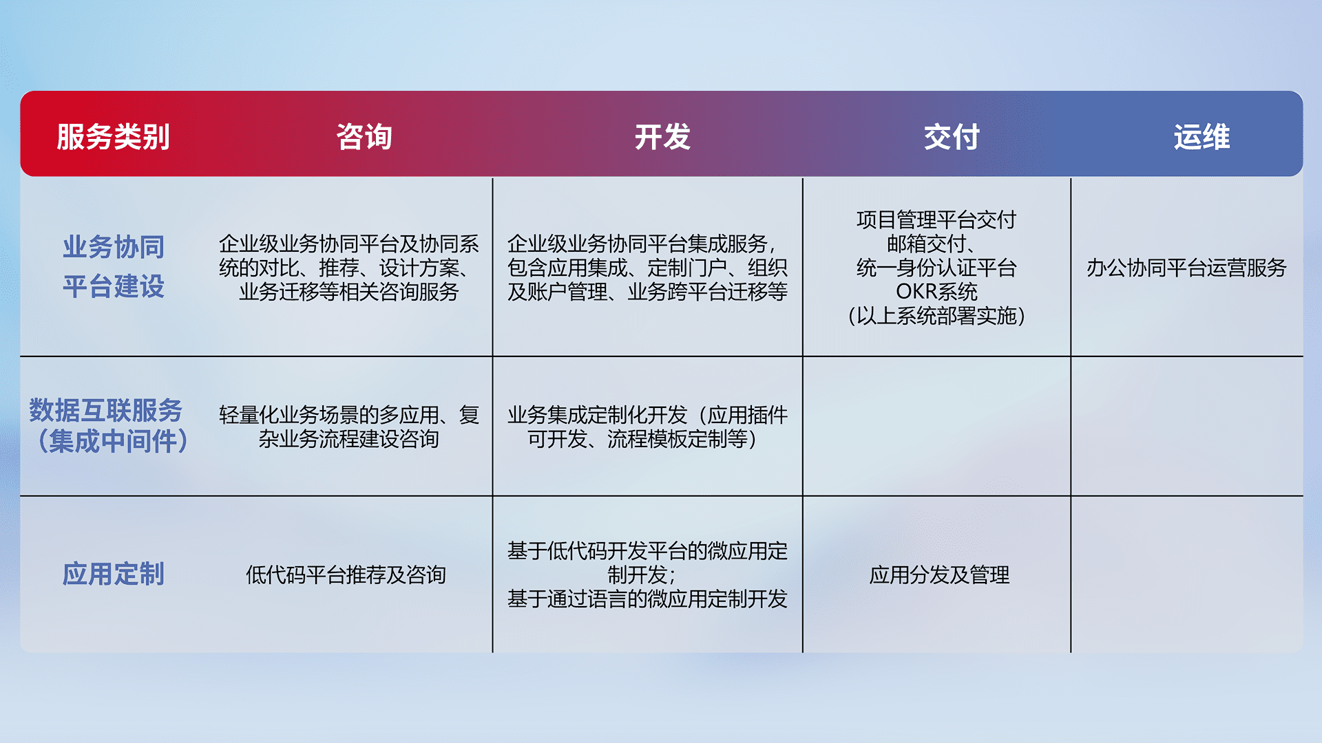 针对钉钉、、企微、、、、IDaas等平台级产品提供产品的规划、、、、方案、、、交付、、定制化开发等服务,,,,实现如统一协同办公、、、智能客户服务、、、、混合会议管理、、、、智能数据查询、、、等业务场景,,,,实现数字化转型。。。。