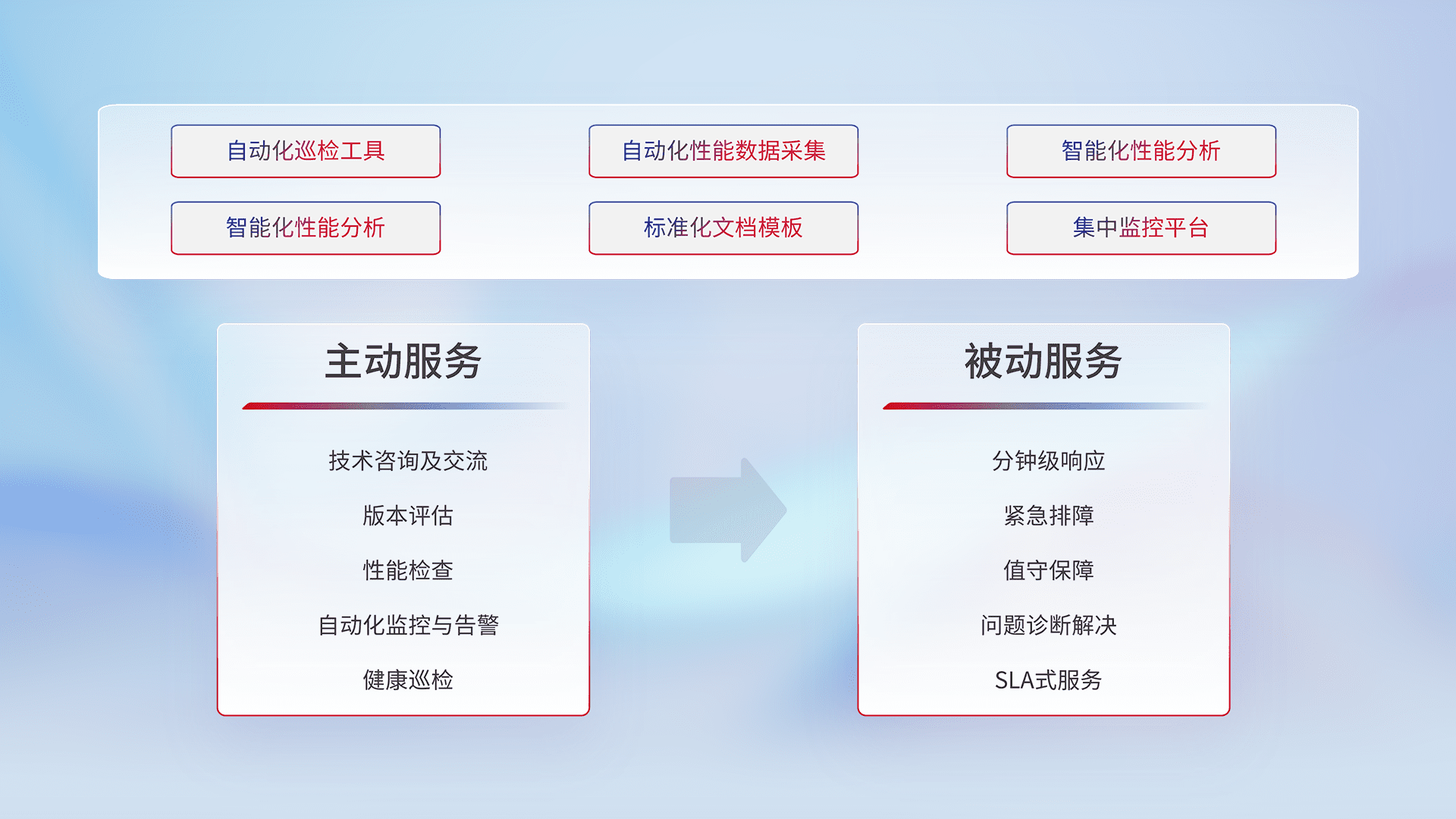 智能化工具和标准化文档,,,,保障服务质量,,,提供主动服务(包含技术咨询、、、、版本评估、、性能检查、、、自动化监控与告警、、健康巡检)和被动服务包含(分钟级响应、、、紧急排障、、、值守保障、、、问题诊断解决、、SLA服务)。。